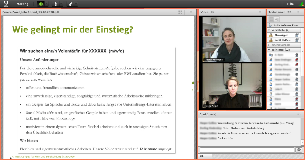 von Sarah Schulz Auch der mediacampus frankfurt hat es sich nicht nehmen lassen zur diesjährigen digitalen Frankfurter Buchmesse, online Veranstaltungen zu organisieren. So fand zum Auftakt der Messe bereits am Dienstag, dem 13. Oktober 2020 ein lockerer, informativer Karriereabend mit Elena Appel, Referentin Berufsbildung beim Börsenverein, und Judith Hoffmann, seit 11 Jahren am mediacampus für