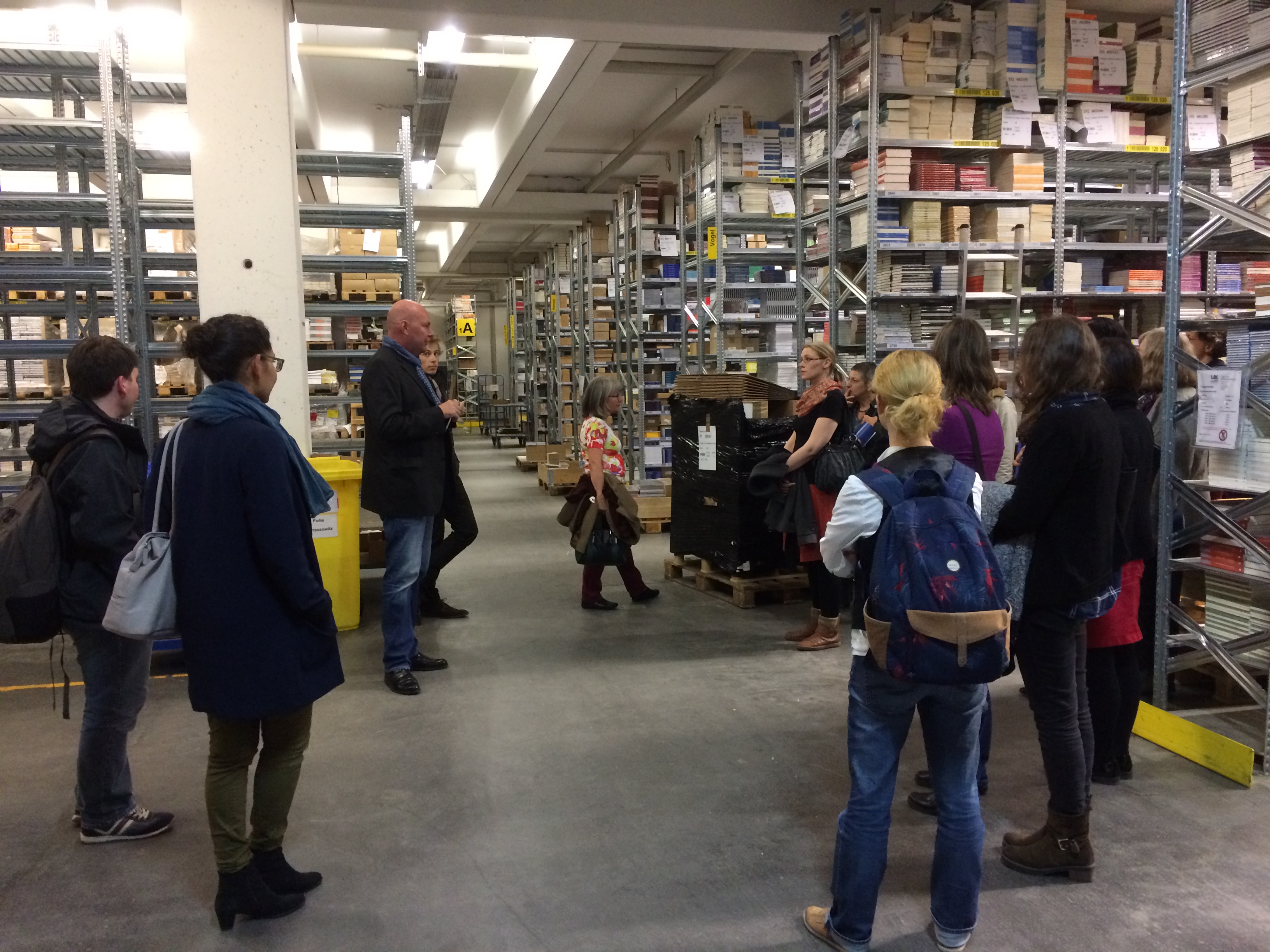 Zu Beginn der Führung durch die Verlagsauslieferung Brockhaus/Commission in Kornwestheim gab Geschäftsführer Matthias Heinrich Einblick in die Veränderungen, mit denen die Branche derzeit konfrontiert ist. „Päckchen packen kann doch jeder!“, habe es früher oft geheißen – dem sei allerdings schon lange nicht mehr so. Neben der Lagerhaltung und der Auslieferung der Verlagstitel hat sich das