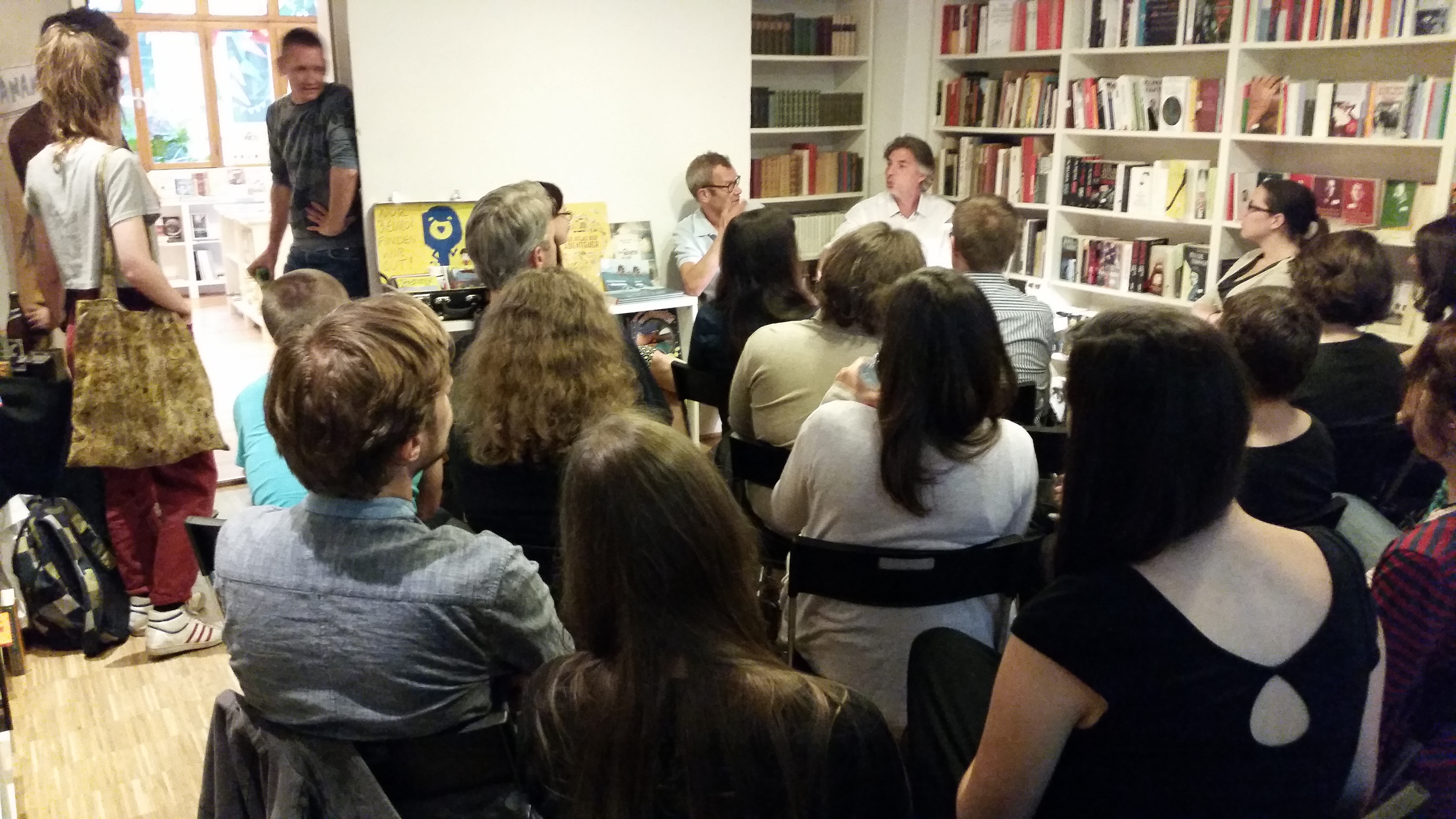 Die ARGE JungbuchhändlerInnen und die Jungen Verlagsmenschen Wien machten gemeinsame Sache und besuchten am 31. Mai 2016 die von Maui und Alban neu übernommene hippe und schöne „Buchhandlung im Stuwerviertel“ im 2. Wiener Gemeindebezirk. In dieser gemütlichen Wohnzimmeratmosphäre ließ es sich besonders gut über Literatur im Allgemeinen und den Bachmannpreis im Besonderen reden. Stefan Gmünder (Literaturredakteur bei der österreichischen Tageszeitung „Der Standard“ und Bachmannpreis-Juror) sowie Tex Rubinowitz (Cartoonist, Musiker, Reisejournalist, Schriftsteller und Bachmannpreisträger 2014) plauderten aus dem Nähkästchen und erzählten 30 Interessierten alles Wissenswerte rund um den Bachmannpreis, der in diesem Jahr sein 40-jähriges Bestehen feiert: von der Entstehung des Preises aus der Gruppe 47 über die Auswahl der Texte, den Ablauf, die Tätigkeit als Juror, die Preisvergabe bis hin zu vielen spannenden und unterhaltsamen Anekdoten aus den vergangenen Jahren, die das Publikum zum Schmunzeln brachten. Ein schöner Abend, der keine Fragen offenließ. Und eine wunderbare Einstimmung auf die Fahrt der JVM Wien zum Bachmannpreis in diesem Jahr.
