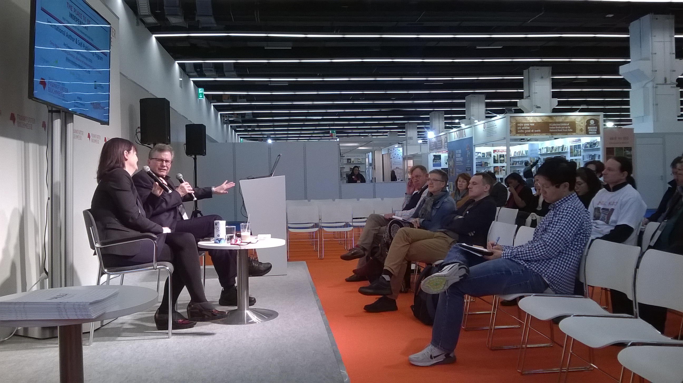 Los geht es am Samstagmorgen im Untergeschoss von Halle 6, auf der Bühne von Publishing Perspectives – die sich in einer ziemlich abgelegenen Ecke befindet, dafür, dass es hier um Perspektiven geht. Der Titel der Veranstaltung lautet „An Overview of Self-Publishing 2016“, sie entpuppt sich aber als Werbung für die Alliance of Independent Authors, deren Gründerin Orna Ross lieber das Wort „abundance“ statt „flood“ mit Content assoziieren möchte. Moderator Porter Anderson ruft dem spärlichen Publikum zu: „You’re not alone“ und „Everyone’s creativity counts“. Allerdings sei die goldene Ära, in denen Selfpublisher etwas Besonderes waren und ihre E-Book-Verkäufe rasant in die Höhe schnellten, ohne dass sie groß etwas tun mussten, vorbei. Er empfiehlt, E-Books zu lesen, um das Leseerlebnis der Buchkäufer nachempfinden zu können. Er selbst finde digitales Lesen auf dem Bildschirm „more immersive“ als auf Papier; vielleicht, weil er immer so viel Fernsehen geschaut habe. Orna Ross warnt davor, in sozialen Netzwerken „unter sich“ zu bleiben und nur anderen Autoren die eigenen Bücher anzuschwatzen: „Other writers are not the audience you need.“