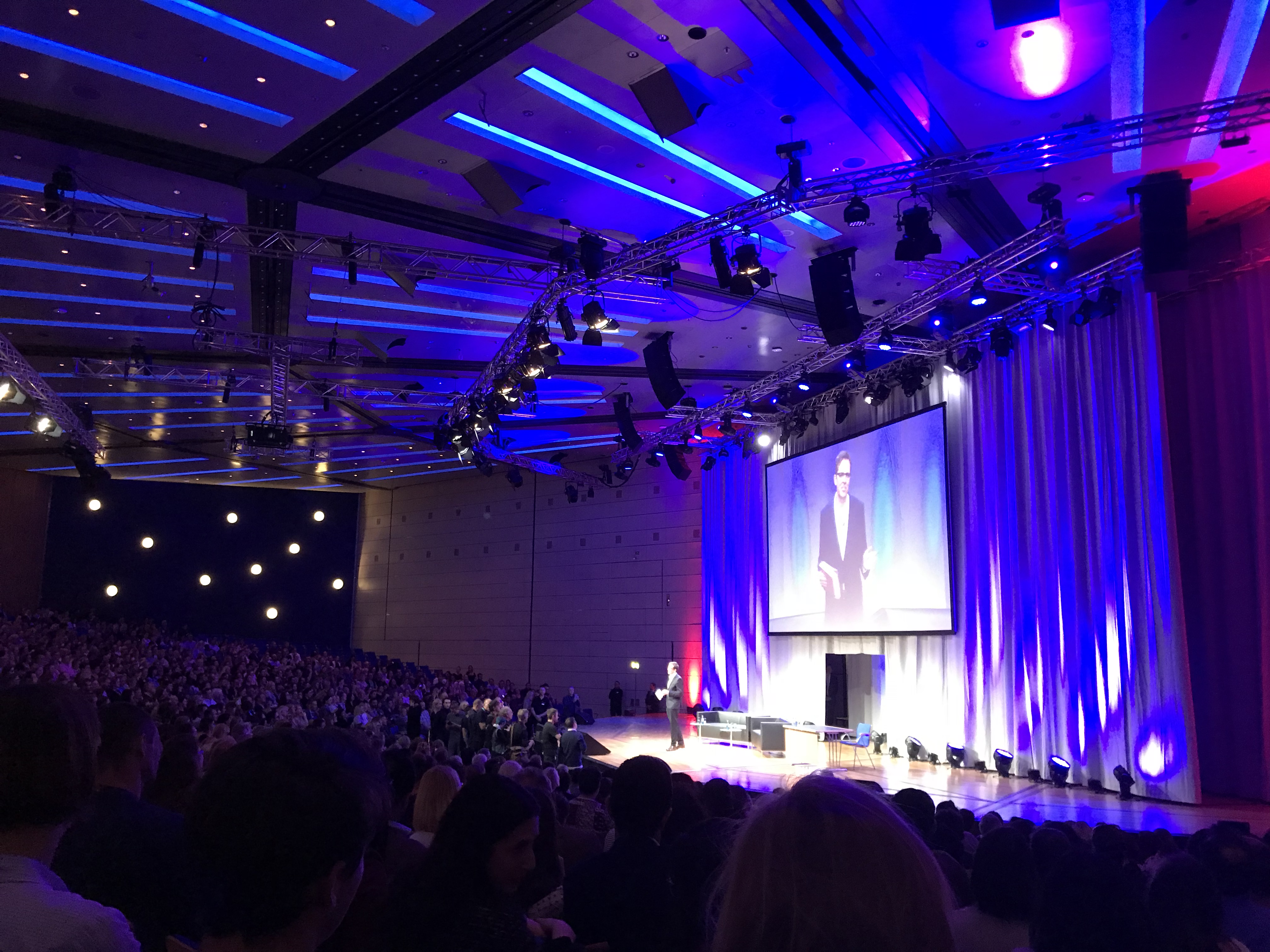 Doch am Samstagabend war es dann auch endlich für die Öffentlichkeit soweit. Der als zurückhaltend geltende US-Amerikaner Dan Brown hatte seinen exklusiven Auftritt auf der Frankfurter Buchmesse 2017. Dies war gleichzeitig die einzige Lesung des neuen Buches Origin in Deutschland in diesem Jahr, bei der Dan Brown zugegen war. Auch aus diesem Grund wurde die Veranstaltung von der Frankfurter Buchmesse in Kooperation mit Bastei Lübbe, Hugendubel und hr2 ganz groß aufgezogen. Sie fand im Harmonie-Saal des Congress Center statt, das sich neben dem Messegelände befindet, und von den 2.200 Karten, die es im Vorverkauf ab 24,50 € gab, wurden fast 2.000 verkauft. Es handelte sich also um eine selbst für Buchmessen-Verhältnisse imposante Kulisse.