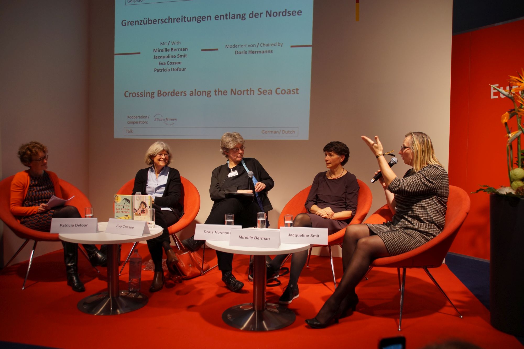 Zu Gast waren Jacqueline Smit, Gründerin und Verlegerin (Uitgeverij Orlando, NL), Mireille Berman, Vermittlerin beim Nederlands Letterenfonds, Eva Cossée, Gründerin und Verlegerin (Uitgeverij Cossee, NL) und Patricia Defour, Verlegerin (WPG Uitgevers, Belgien). Moderiert wurde die Runde von der Autorin, Herausgeberin und BücherFrau Doris Hermanns (Link), die selbst 25 Jahre lang in den Niederlanden gelebt und dort ein Antiquariat geführt hat.
