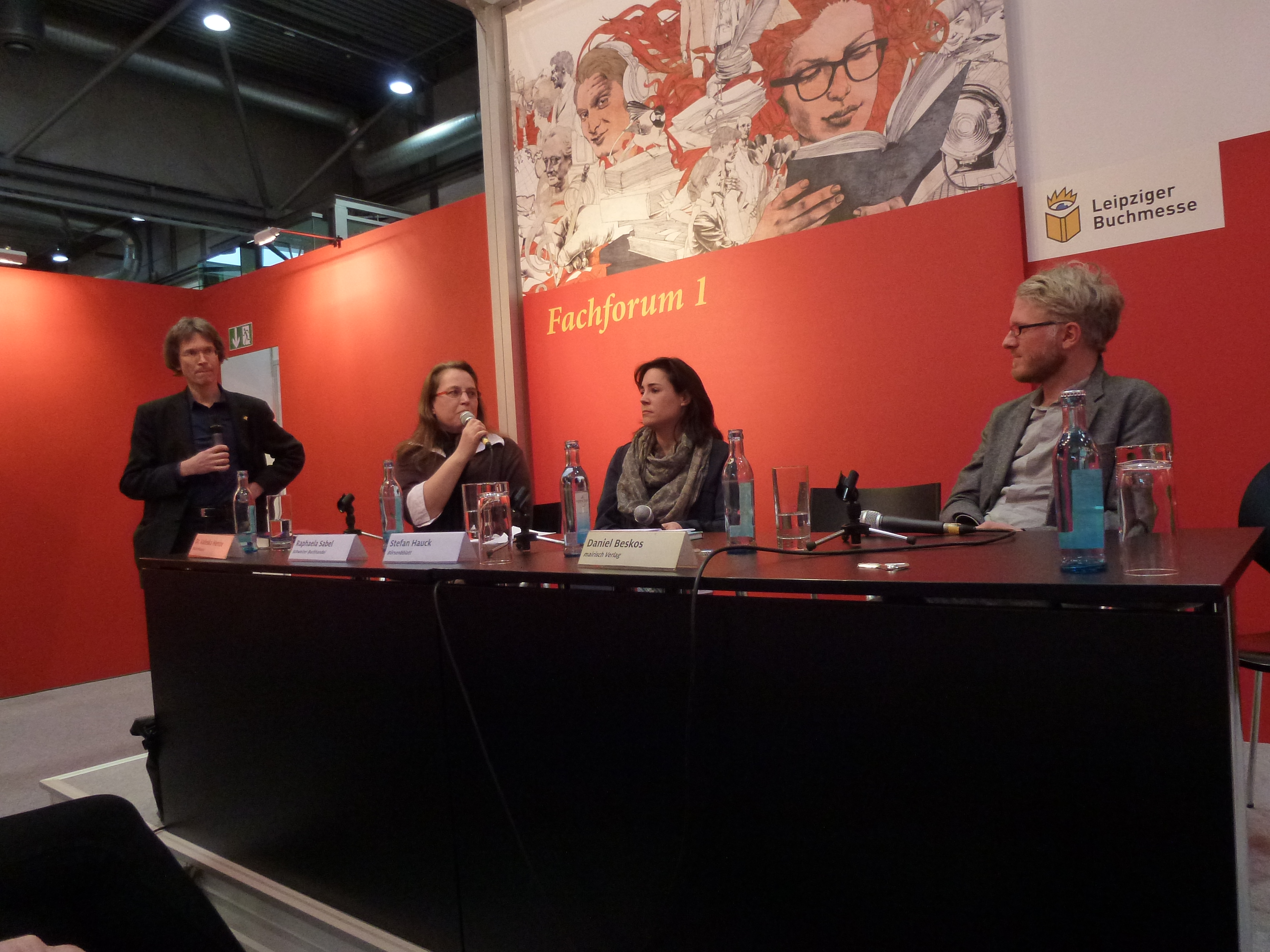 Vorn sitzen vier Menschen, zu gleichen Teilen männlich und weiblich, was mir schon mal gut gefällt. Dabei sind auch Dr. Valeska Henze (freie Übersetzerin und Bücherfrau) und Daniel Beskos (mairisch Verlag).