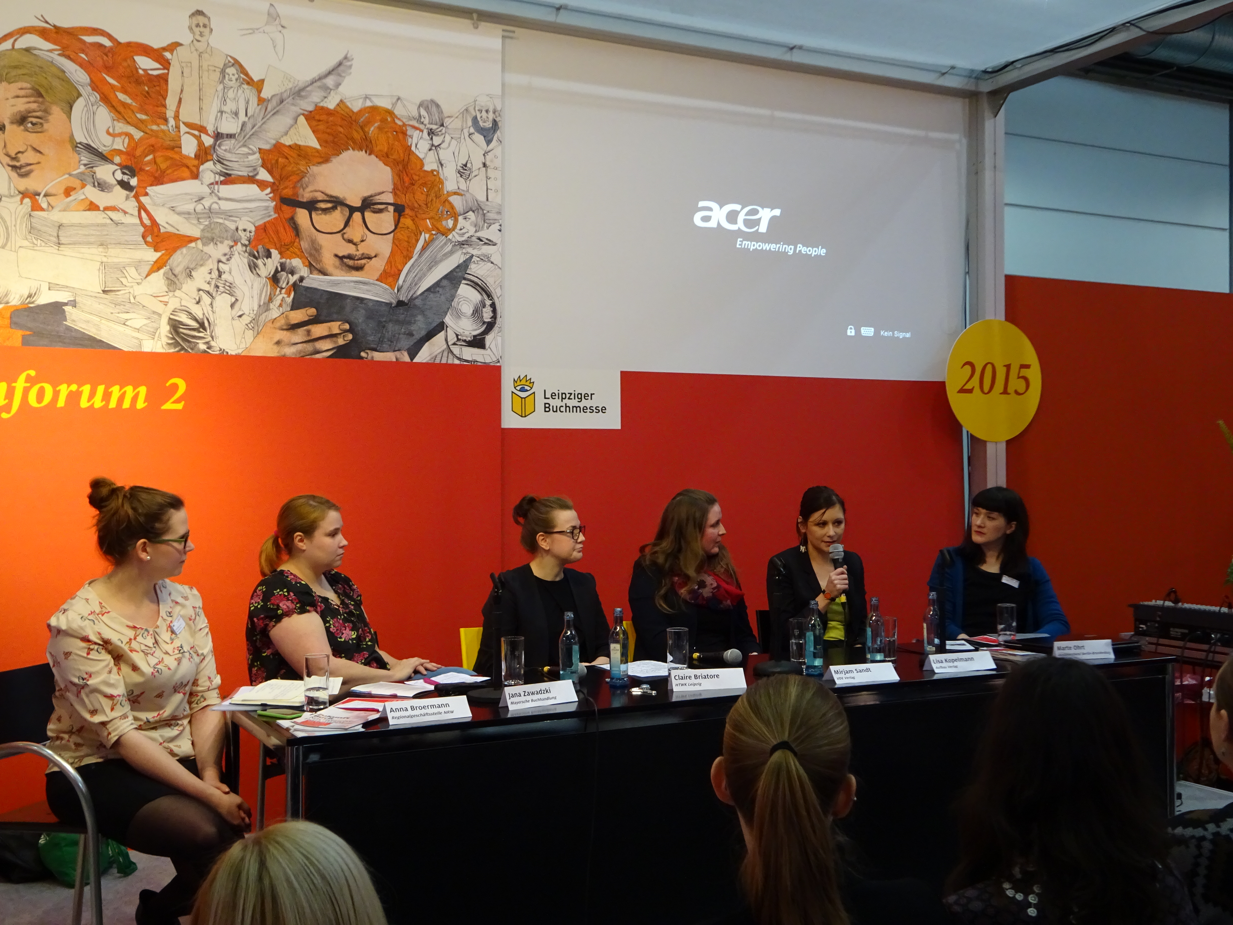 Die Schilderungen der Referentinnen machten Mut zur Bewerbung um den Traumberuf und dazu, verschiedene Teile der Buchbranche kennenzulernen, sich auszuprobieren und auch mit einem weniger konsequenten Lebenslauf erfolgreich den Einstieg in die Tätigkeit als BuchhändlerIn, einen Verlag oder das Volontariat zu bewältigen. Trotz der verschiedenen Arbeitsbereiche und den unterschiedlichen Verläufen ihrer beruflichen Laufbahnen würden rückblickend alle vier Diskussionspartnerinnen immer wieder den Weg in die Buchbranche einschlagen. Auf Anna Boermanns provokatives Rezitieren des Ausspruchs „Das Buch ist tot!“, kontert Mirjam Sandt blitzschnell „Es lebe das Buch!“ und zeigt so, dass es noch immer lohnenswert ist, irgendwas mit Büchern zu machen.