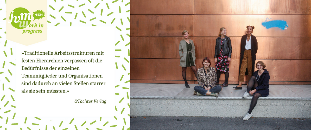 Der &Töchter Verlag ist ein neugegründetes Unternehmen mit einer Besonderheit: Es gibt keine Führungsperson, denn alle fünf Gründerinnen haben gleich viel zu sagen. Das selbstorganisierte Team hat sich Strukturen aufgebaut, die ohne Hierarchien auskommen und (bisher) trotzdem nicht in Chaos verfallen. Diese Arbeitsweise bringt viele Herausforderungen mit sich, hat aber auch viele Chancen auf selbstbestimmtes Arbeiten.
