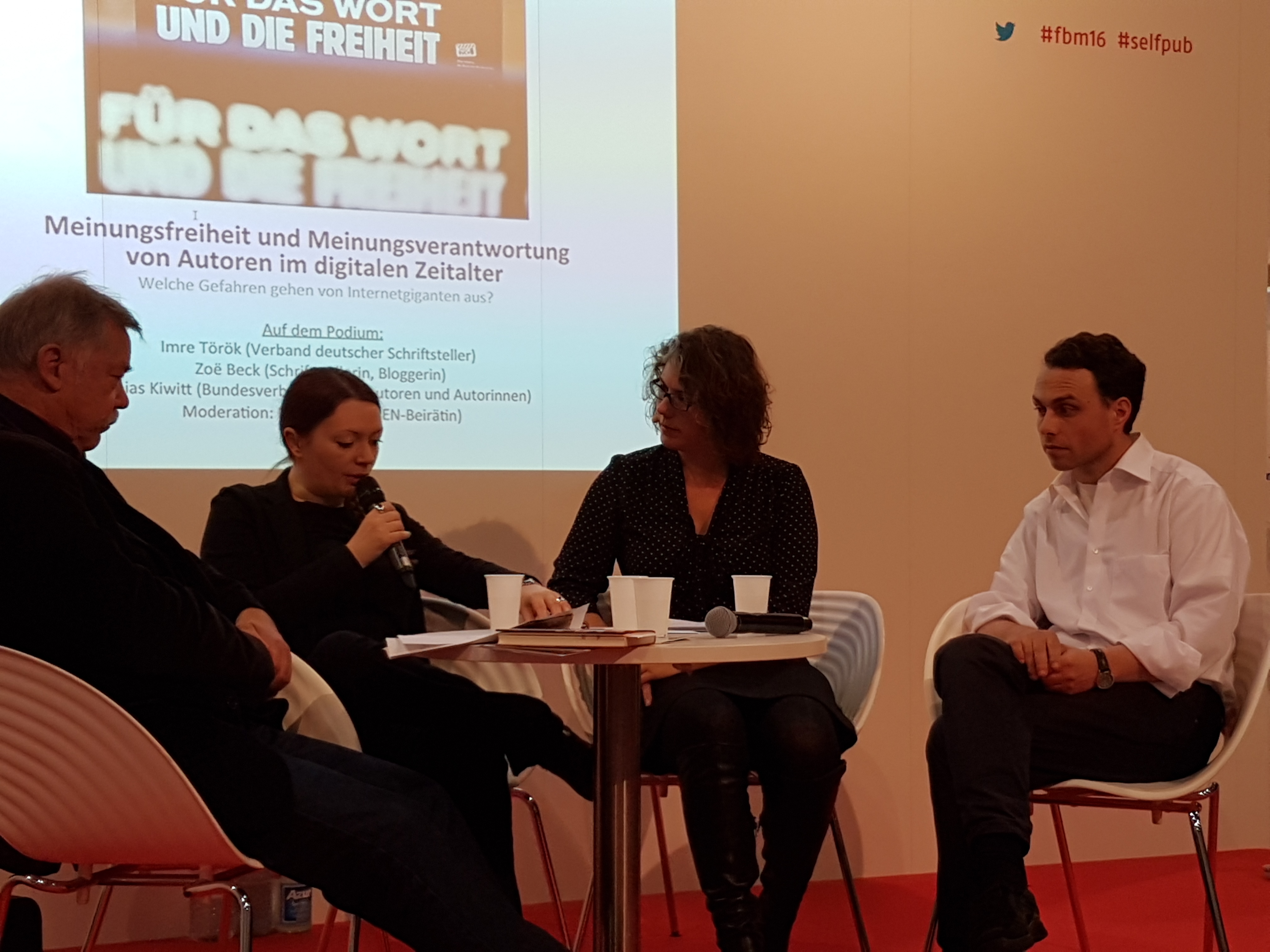 Am Messesonntag finden nahezu zeitgleich zwei Highlights in Frankfurt statt. In der Paulskirche wird der Friedenspreis des deutschen Buchhandels an Carolin Emcke verliehen und auf dem Podium der Selfpublisherbühne moderiert Nina George, Schriftstellerin und Beirätin des PEN-Präsidiums, die vom Netzwerk Autorenrechte initiierte Veranstaltung Meinungsfreiheit und Meinungsverantwortung.