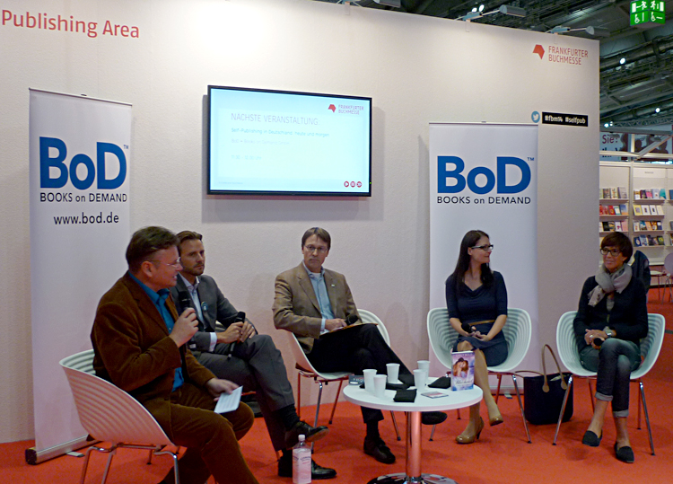 Auf der Bühne der Selfpublishing Area trafen sich zur Diskussion unter Moderation von Wolfgang Tischer von Literaturcafe.de der BoD-Geschäftsführer Dr. Florian Geuppert, Professor Joerg Pfuhl von der Stiftung Lesen, Selfpublishing-Autorin Emily Bold und Kirsten Rühs, Inhaberin der gleichnamigen Buchhandlung in Bad Nauheim. Es ging um die Frage, was die größten Herausforderungen sind und wie sich das Selfpublishing entwickeln wird. Eine BoD-Studie unter 2100 Autoren ergab 2013, dass die meisten Autoren schon länger Selfpublishing nutzen, im Durchschnitt sechs Bücher veröffentlicht haben und viele durchaus bei traditionellen Verlagen veröffentlicht haben. Nicht mehr nur Hobby-Autoren nutzen Selfpublishing, sondern die Autoren werden zunehmend professioneller.