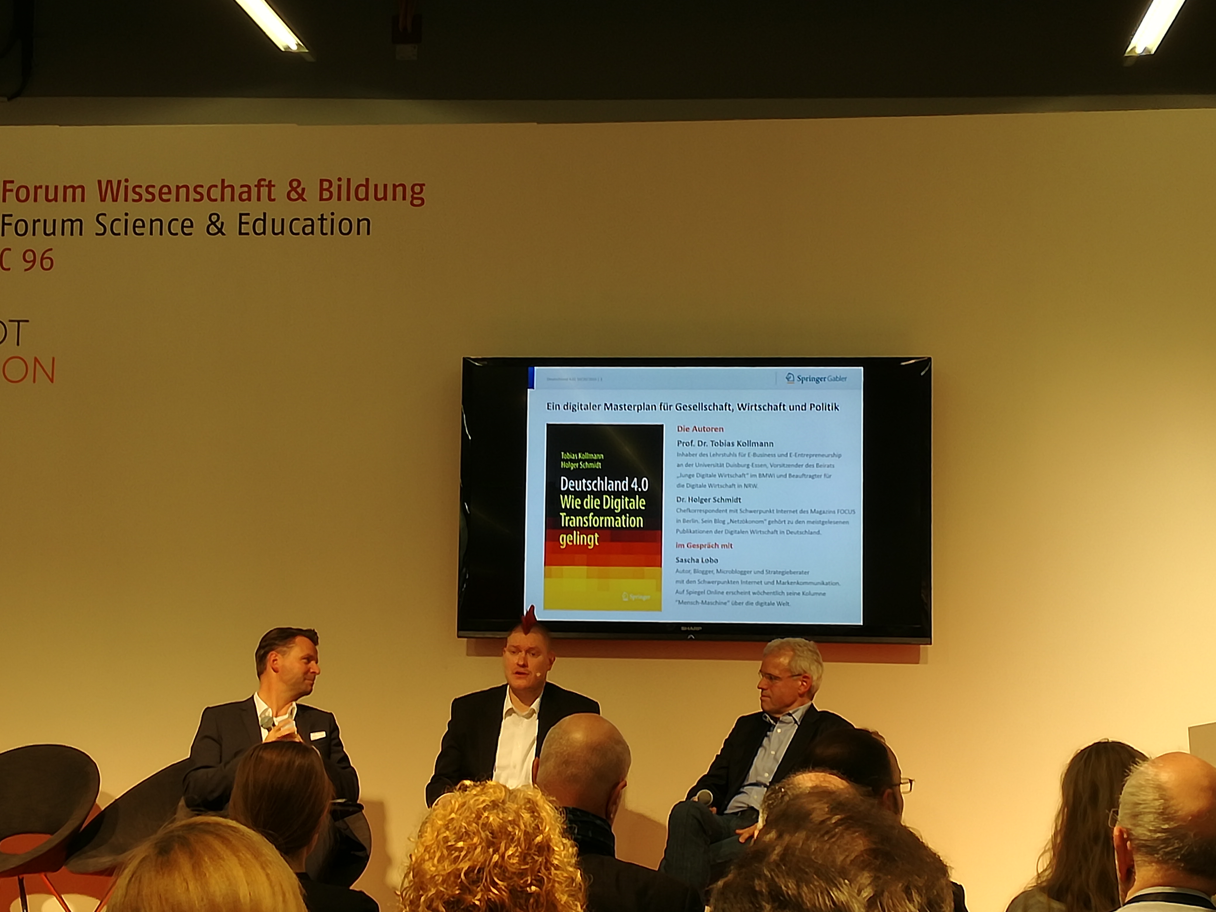 Welches Areal könnte passender sein für dieses Thema, das auf die Zukunft ausgerichtet ist, als die Ebene 4.2.? Zumindest das Setting auf der Hot-Spot-Education-Bühne ist quasi der 4.0-Zeit schon voraus. Deutschland dagegen, hinkt der digitalen Transformation noch ziemlich hinterher. Das kritisieren die Ökonomen Prof. Dr. Tobias Kollmann und Dr. Holger Schmidt in ihrem neuen Buch