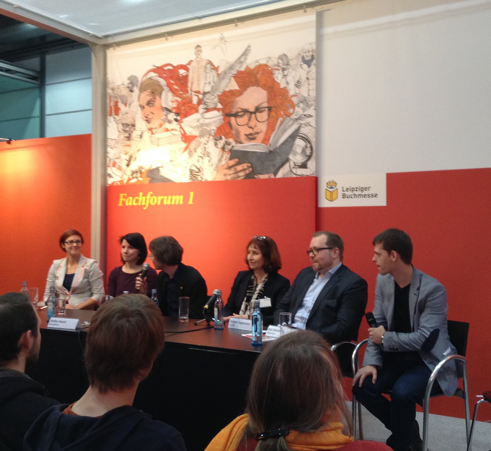 Halle fünf steht am Messefreitag im Zeichen des von der Leipziger Buchmesse und dem Börsenverein des Deutschen Buchhandels veranstalteten Karrieretags Buch und Medien. Die Stuhlreihen vor der Fachforum-Bühne sind im Handumdrehen belegt, zahlreiche Neugierige machen es sich auf dem Boden bequem, um der Podiumsdiskussion „Viel mehr als Lektorate – Neue Berufsprofile in der Buchbranche“ zu lauschen. Auf dem Podium: Sarah Lange (S. Fischer Verlag), Karla Paul (Hoffmann und Campe), Angelika Schaack (Hörcompany) und Volker Oppmann (LOG.OS / Onkel & Onkel). Die Moderation übernehmen die Börsenblatt-Redakteure Stefan Hauck und Kai Mühleck.